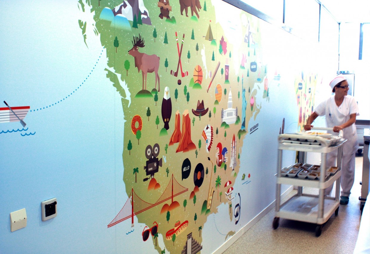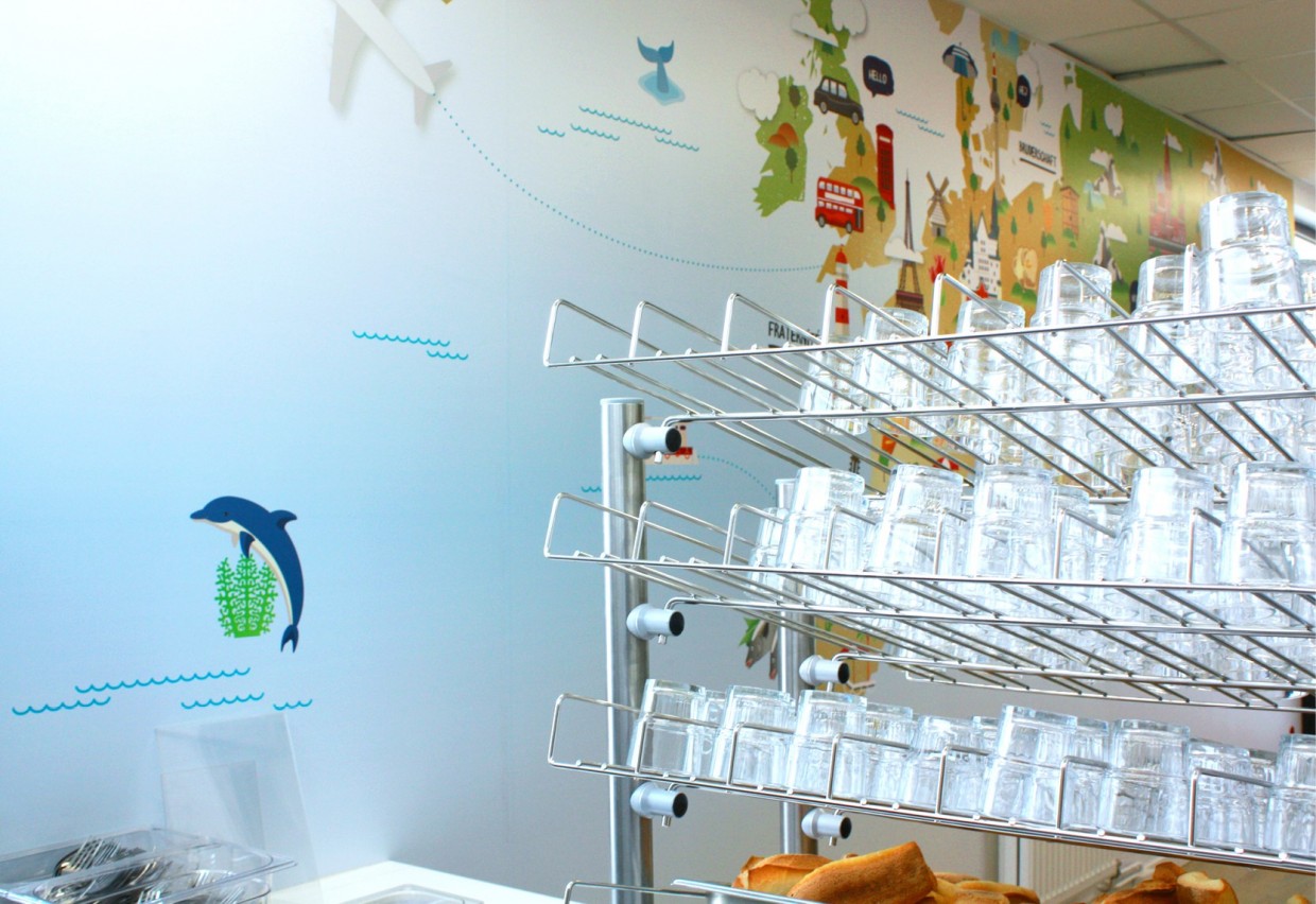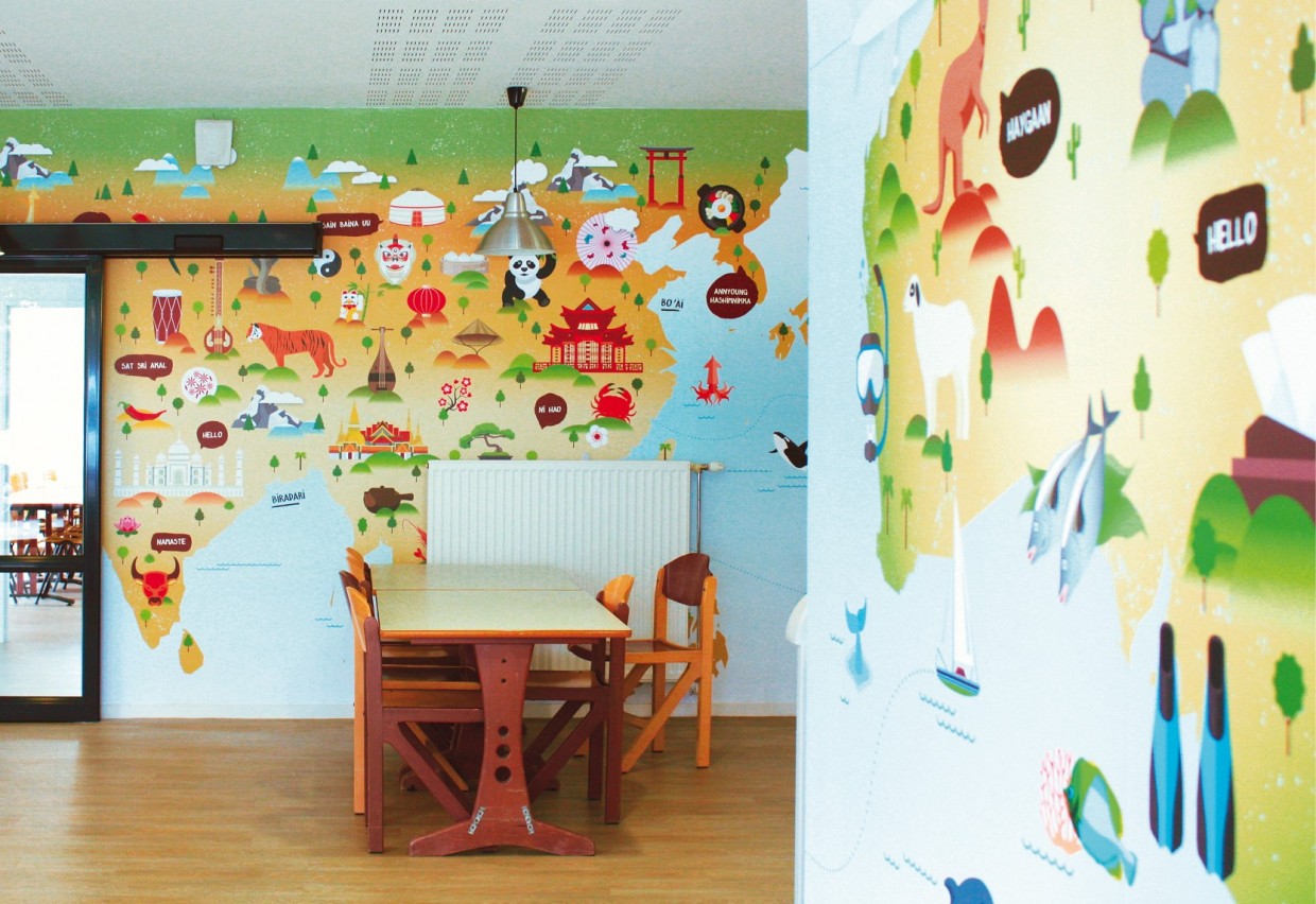 Le réfectoire accueille les patients du Centre ainsi que les élèves de l’école primaire de Varennes-Jarcy. La fresque s’articule autour d’un thème choisi avec les enfants : le « Voyage ». L’illustration en flat design permet d’élaborer un inventaire de formes simples pour une lisibilité par tous.