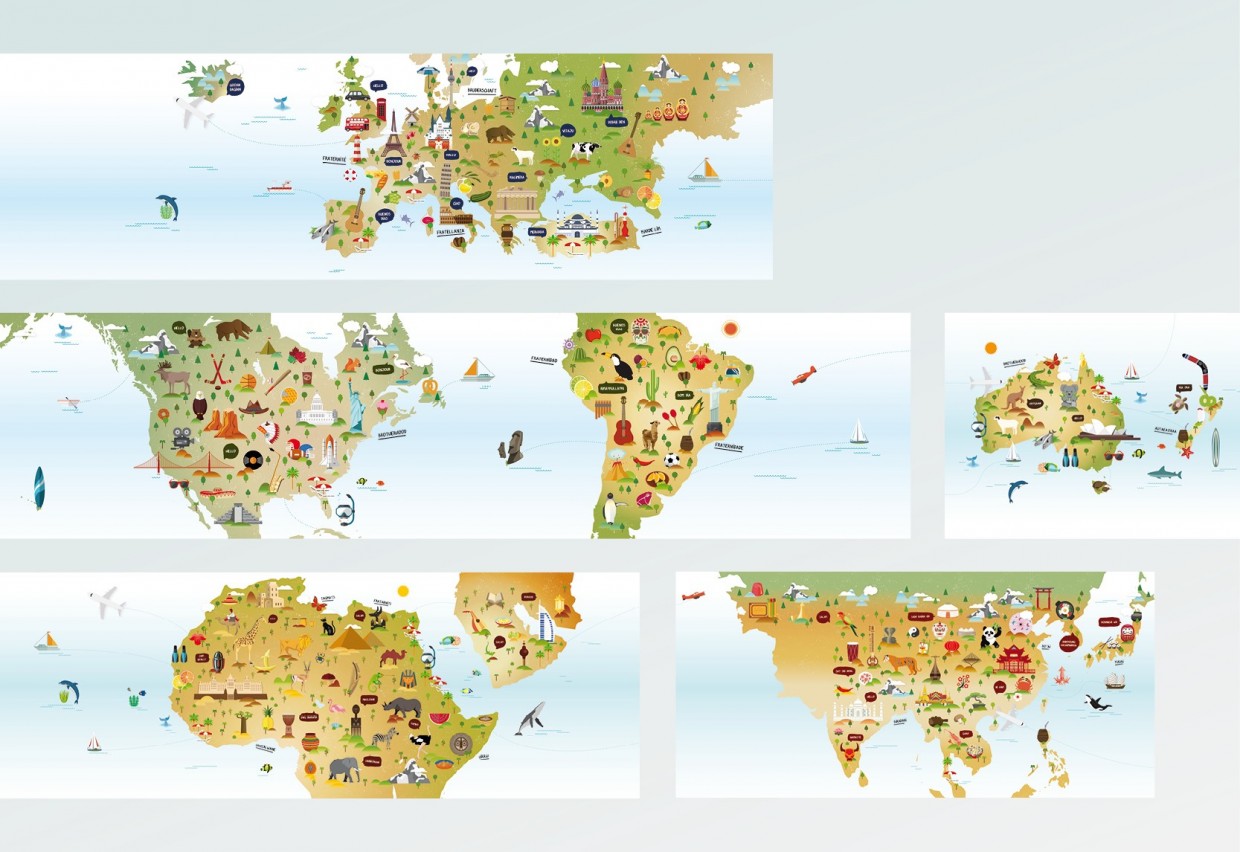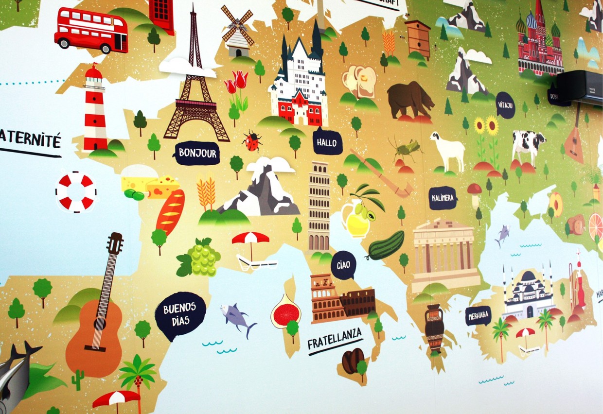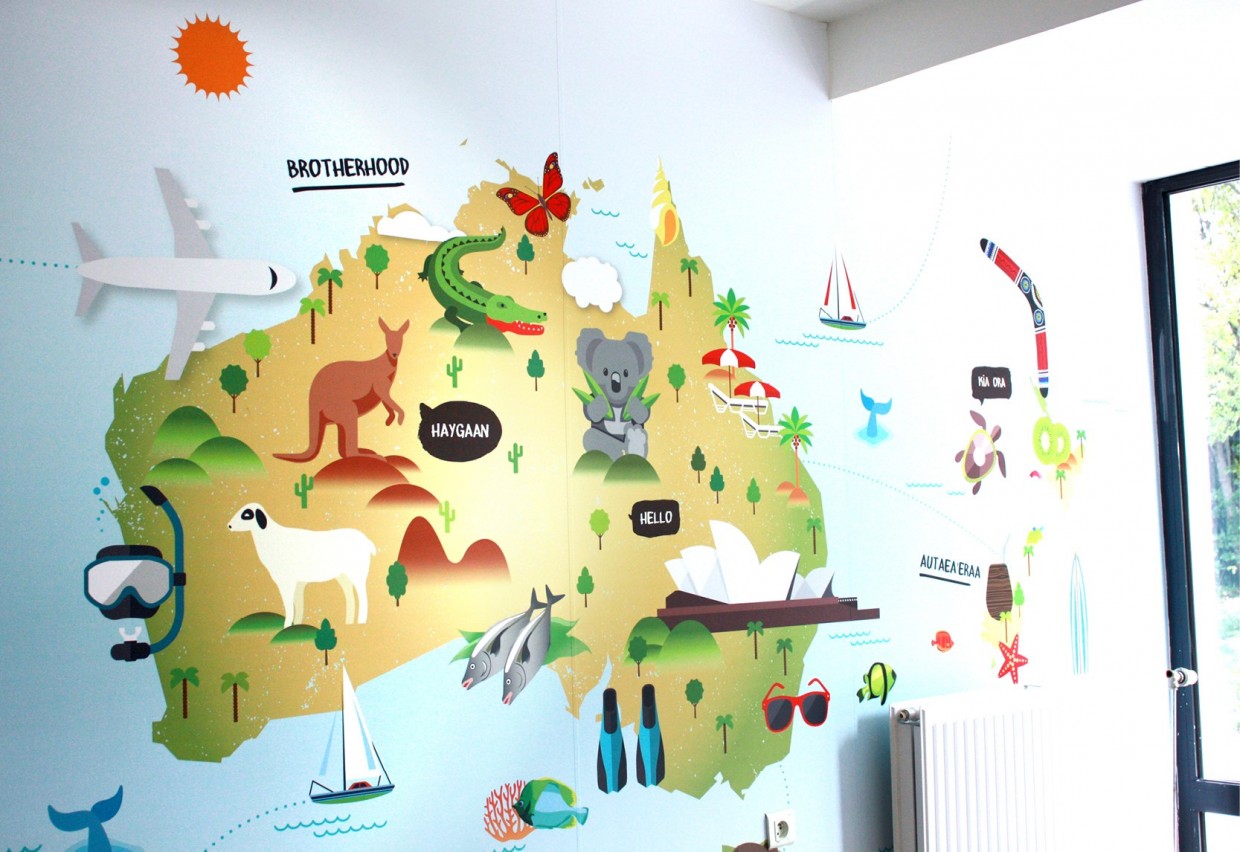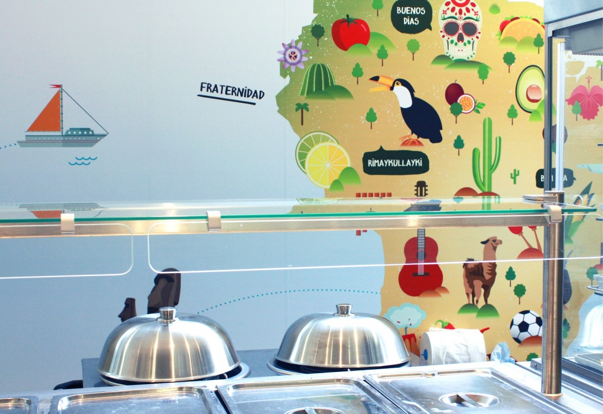 Le réfectoire accueille les patients du Centre ainsi que les élèves de l’école primaire de Varennes-Jarcy. La fresque s’articule autour d’un thème choisi avec les enfants : le « Voyage ». L’illustration en flat design permet d’élaborer un inventaire de formes simples pour une lisibilité par tous.