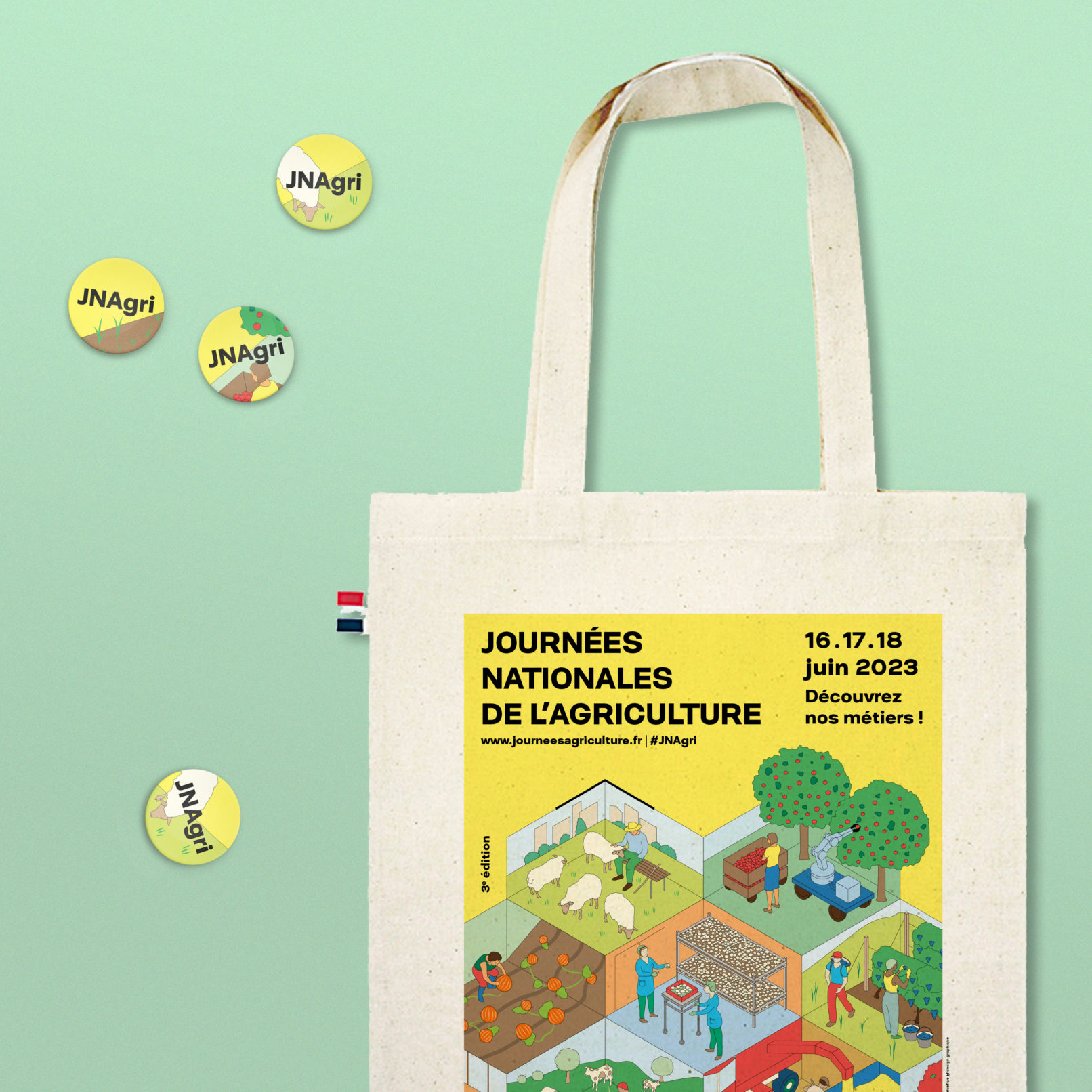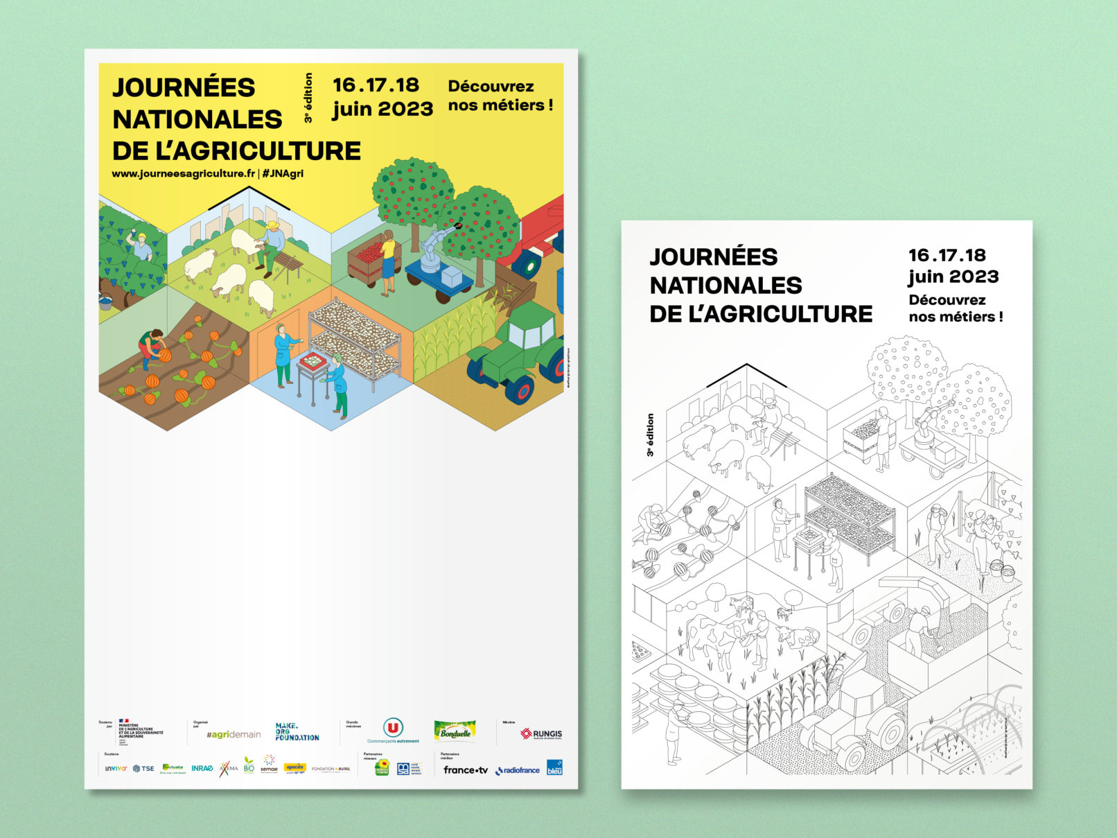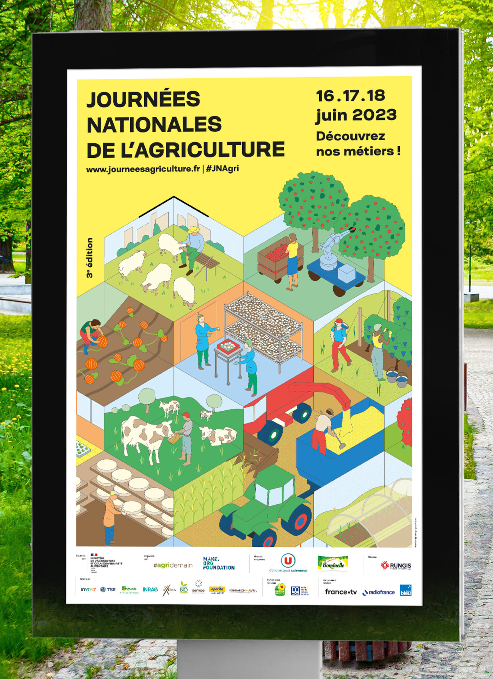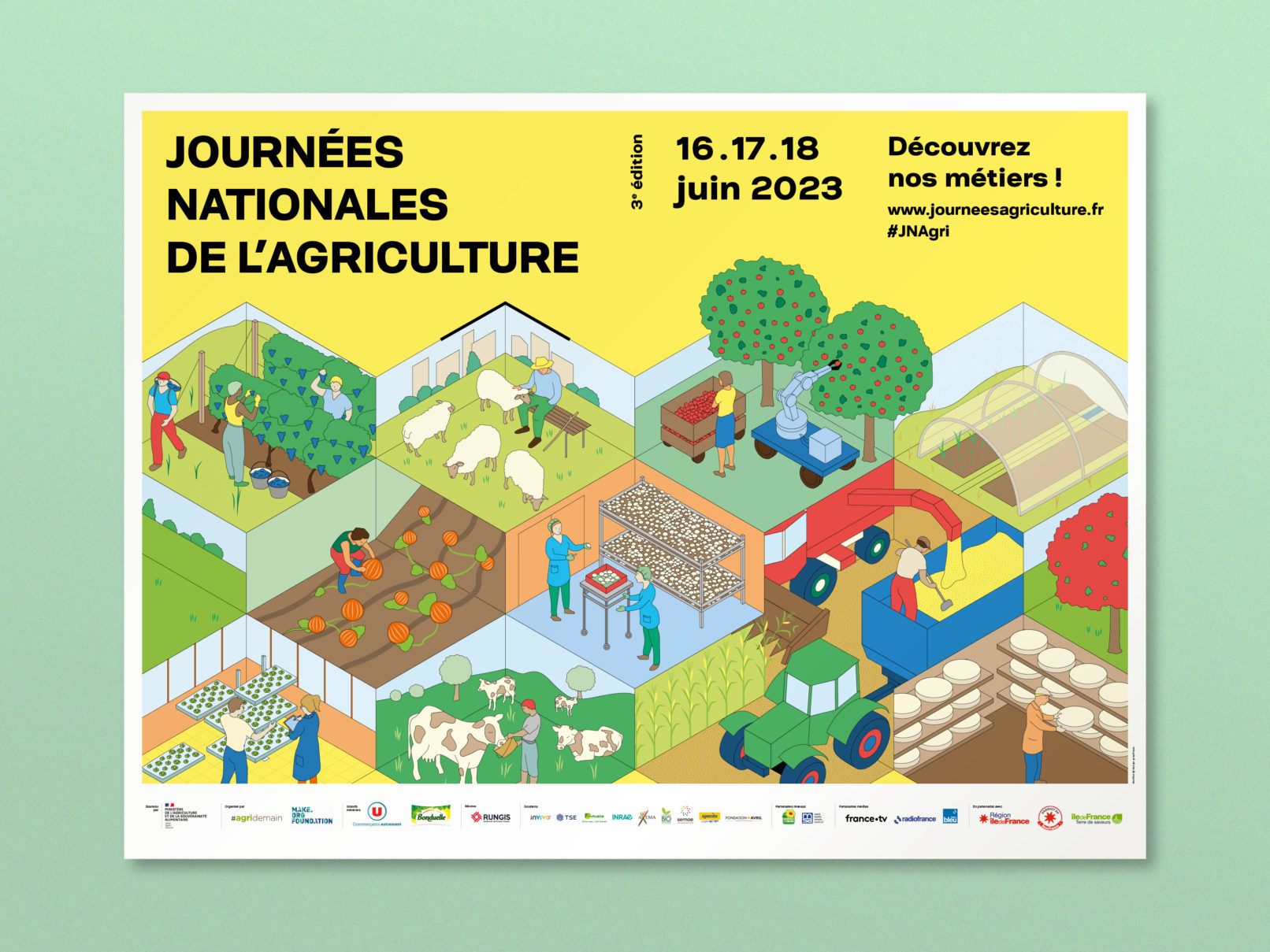 Les Journées Nationales de l’Agriculture permettent aux français de connaître ou re-découvrir les métiers ainsi que le dynamisme de l’agriculture et des territoires. Pour l’édition 2023, l’identité visuelle est repensée en scénettes isométriques qui constituent un paysage agricole multiple.
