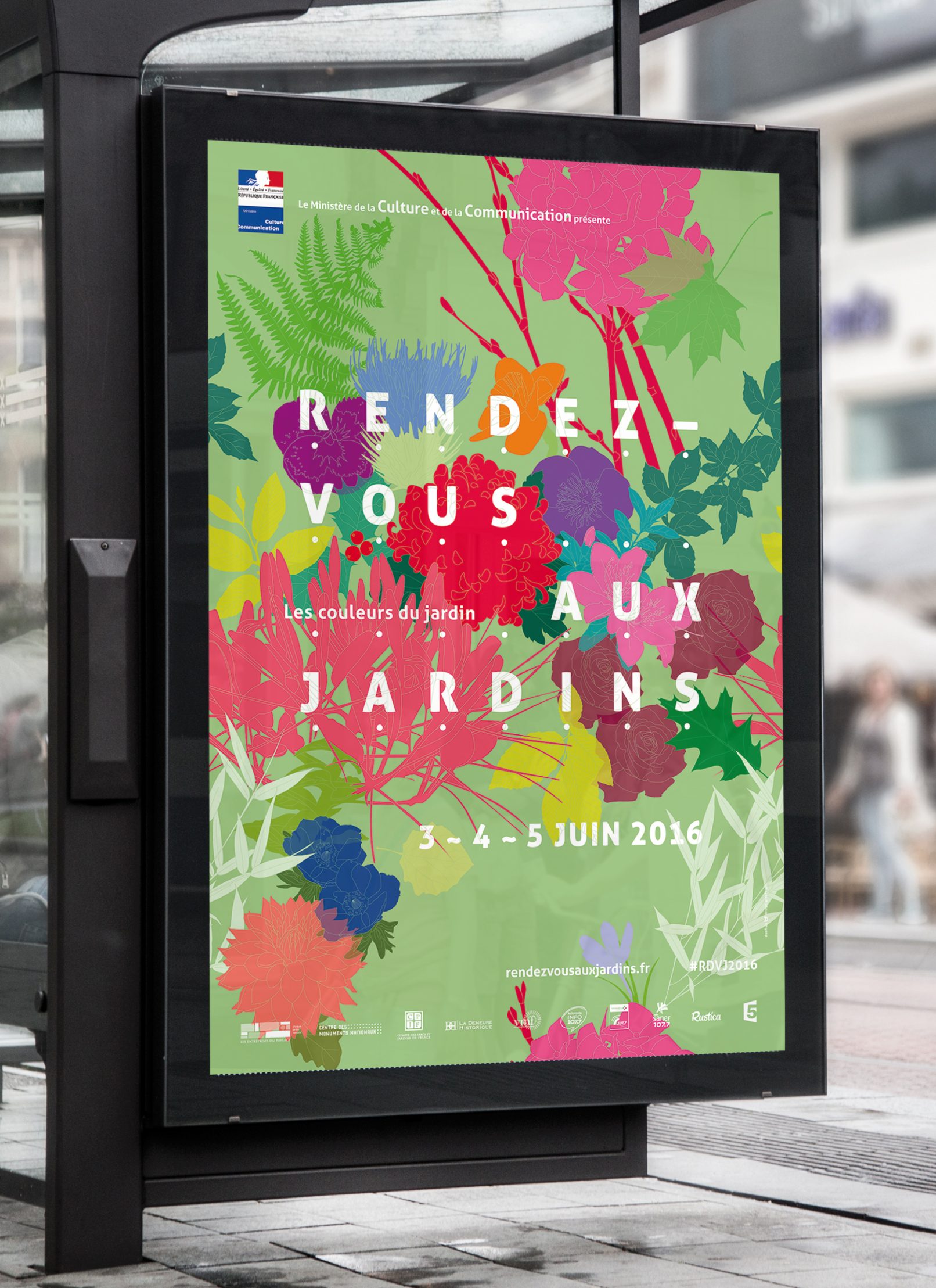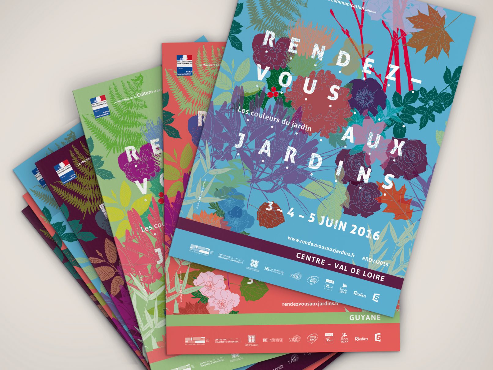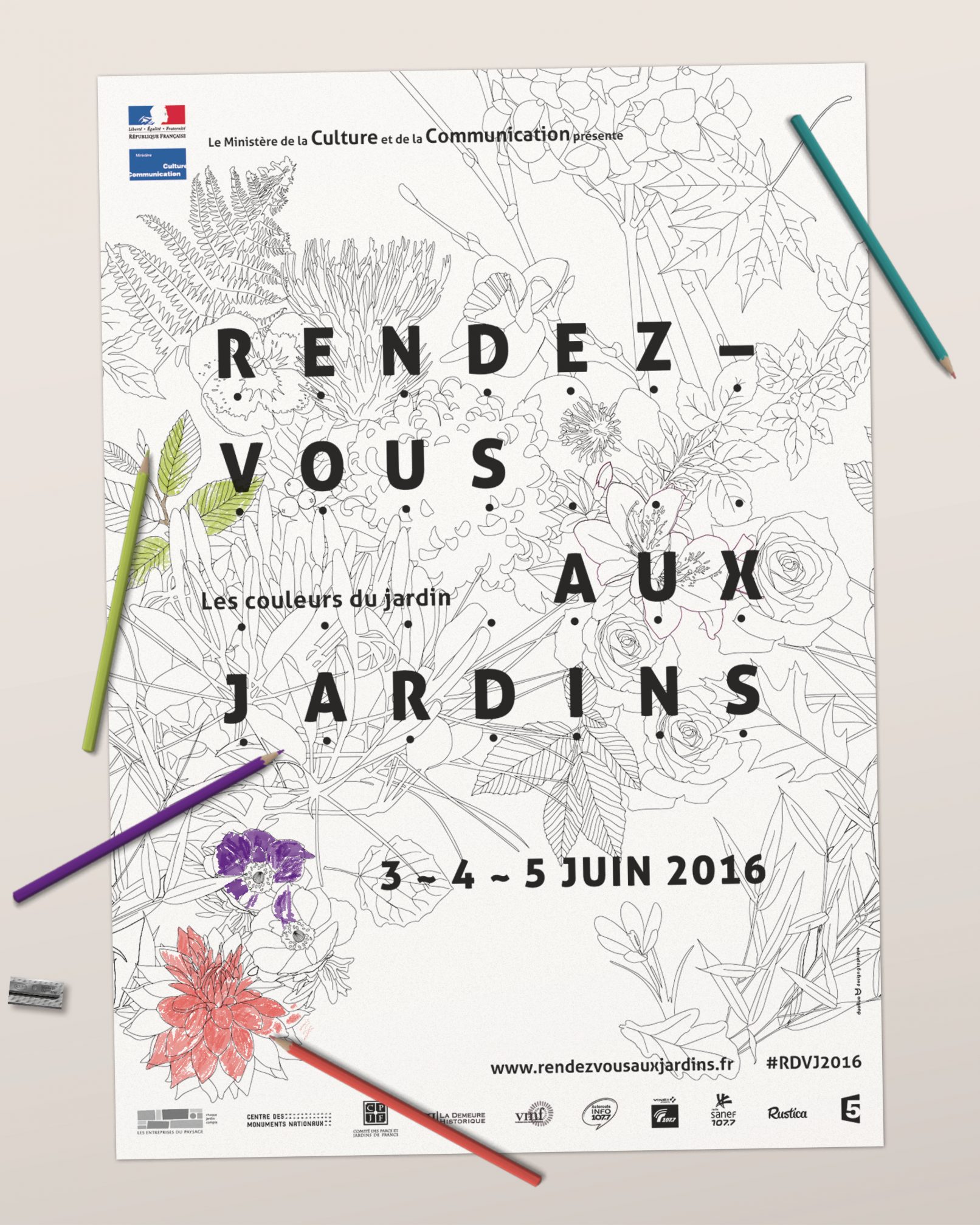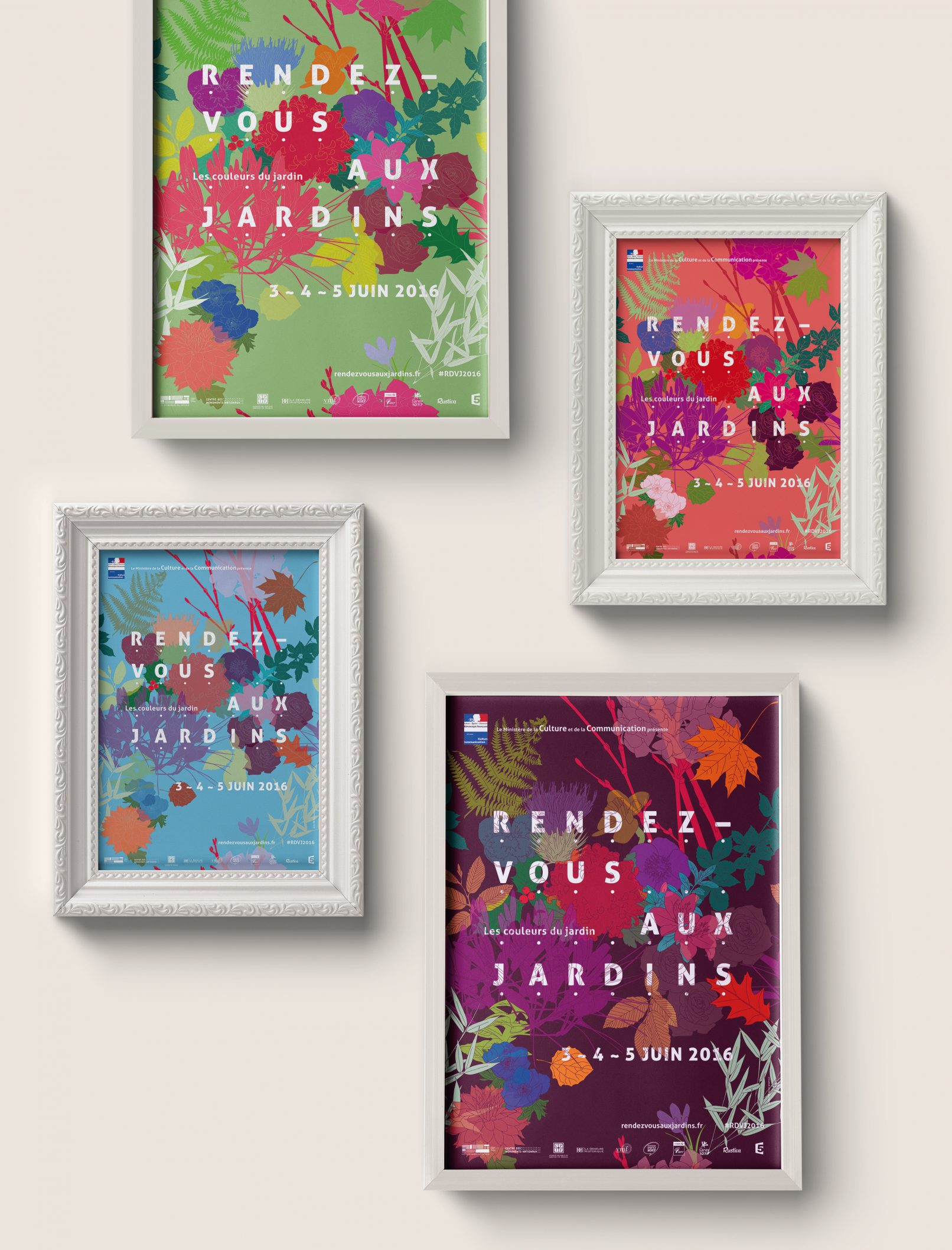 Printemps, été, automne et hiver voient naître différentes variétés et couleurs dans les jardins. Pour la thématique 2016 de cette belle manifestation nationale, nous créons une série de 4 affiches représentant un même motif à chaque saison. Le visuel se travaille à l’infini : dupliqué tel un lé de papier peint, zoomé pour s’y promener, en filaire à colorier…