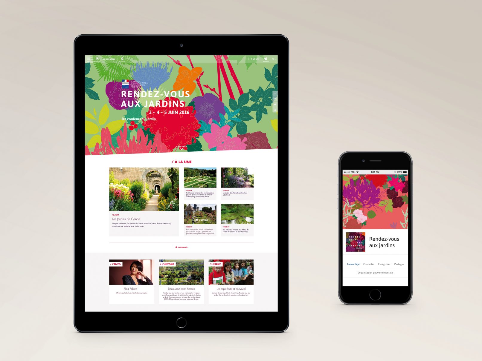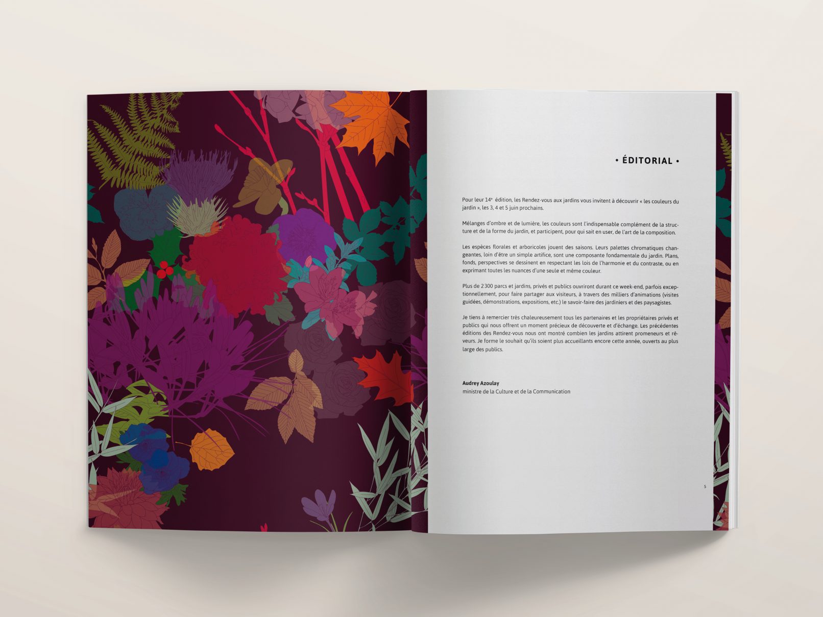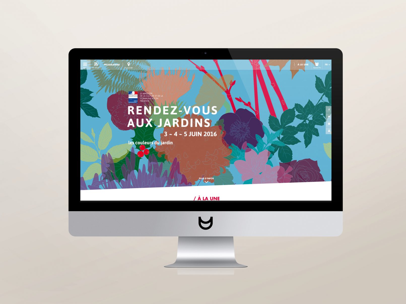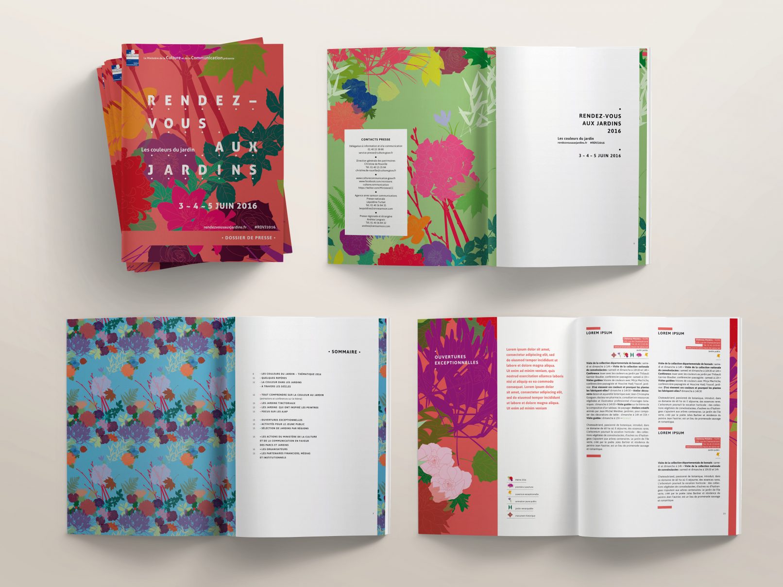 Printemps, été, automne et hiver voient naître différentes variétés et couleurs dans les jardins. Pour la thématique 2016 de cette belle manifestation nationale, nous créons une série de 4 affiches représentant un même motif à chaque saison. Le visuel se travaille à l’infini : dupliqué tel un lé de papier peint, zoomé pour s’y promener, en filaire à colorier…