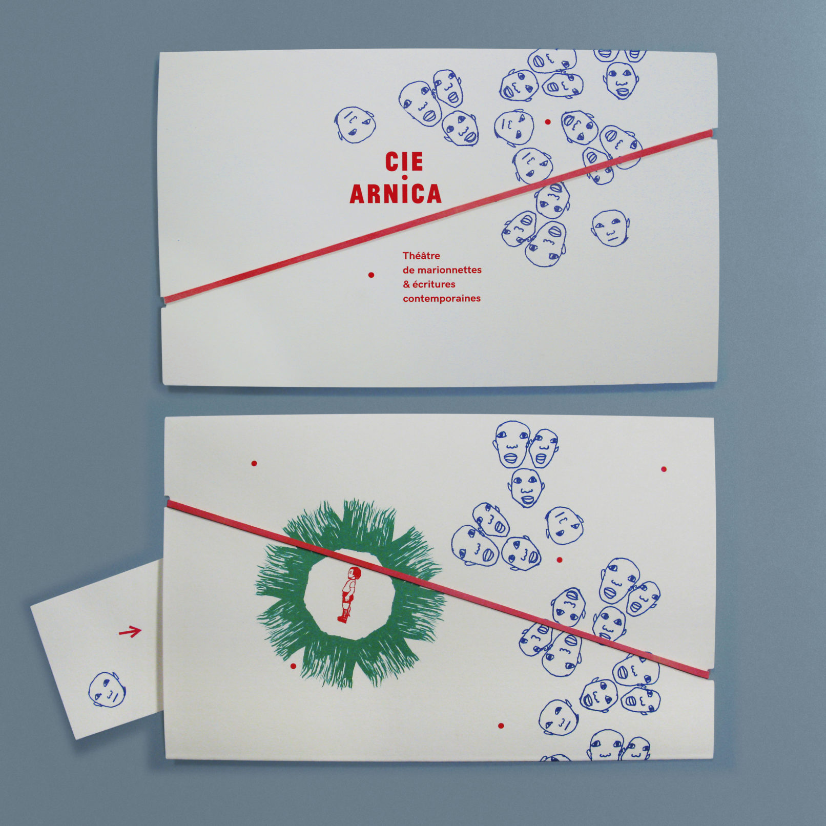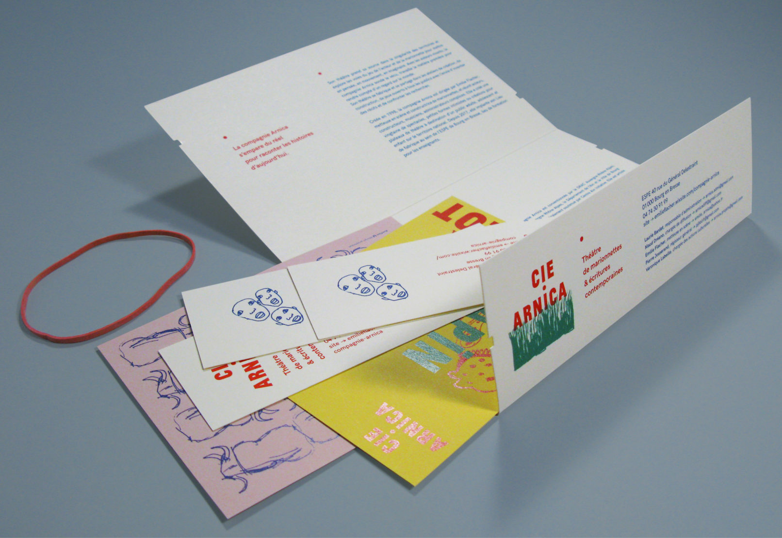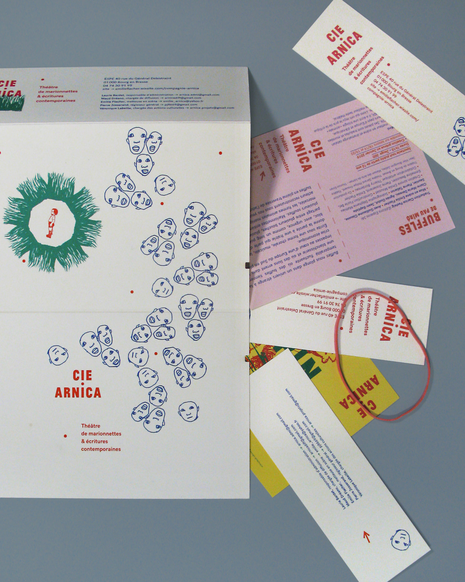 La compagnie Arnica, théâtre de marionnettes & écritures contemporaines, est aussi un lieu de fabrique. L’identité visuelle associe, dans un esprit artisanal, une typographie « tampon » et les croquis de la metteure en scène Emilie Flacher. Les supports sont imprimés en 3 teintes sur la gamme de papier Woodstock chez Fedrigoni.