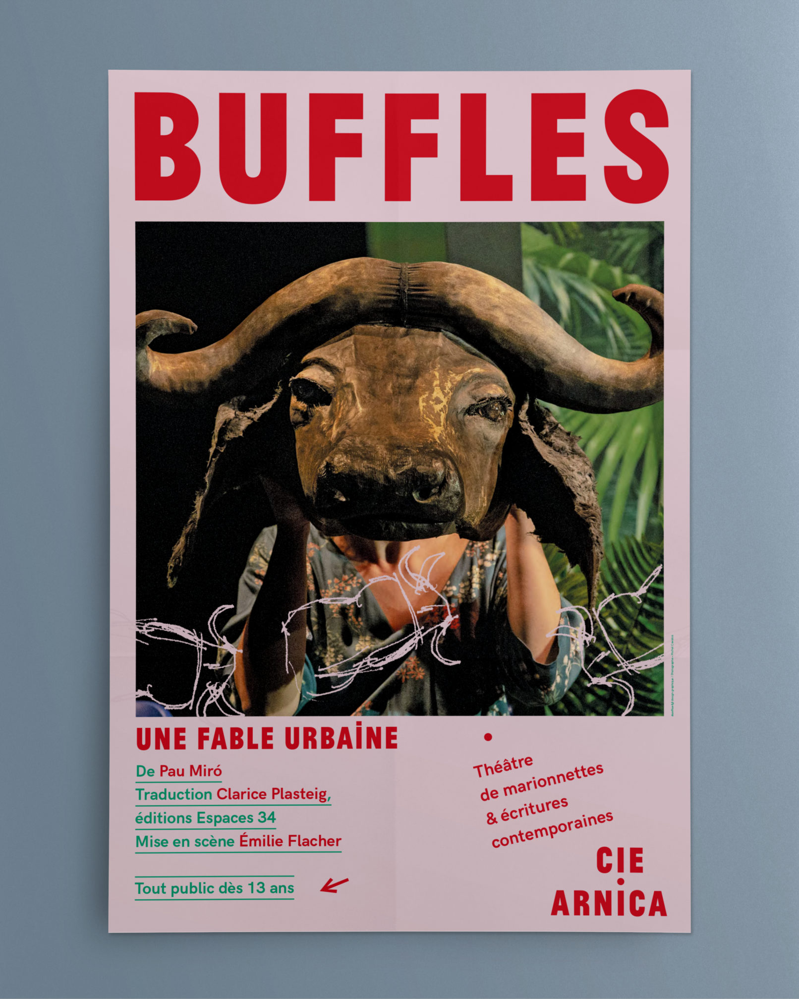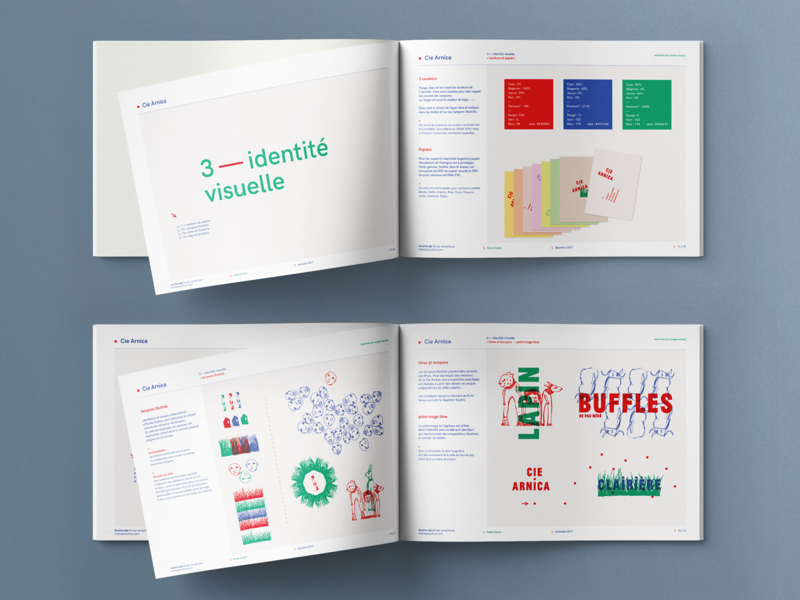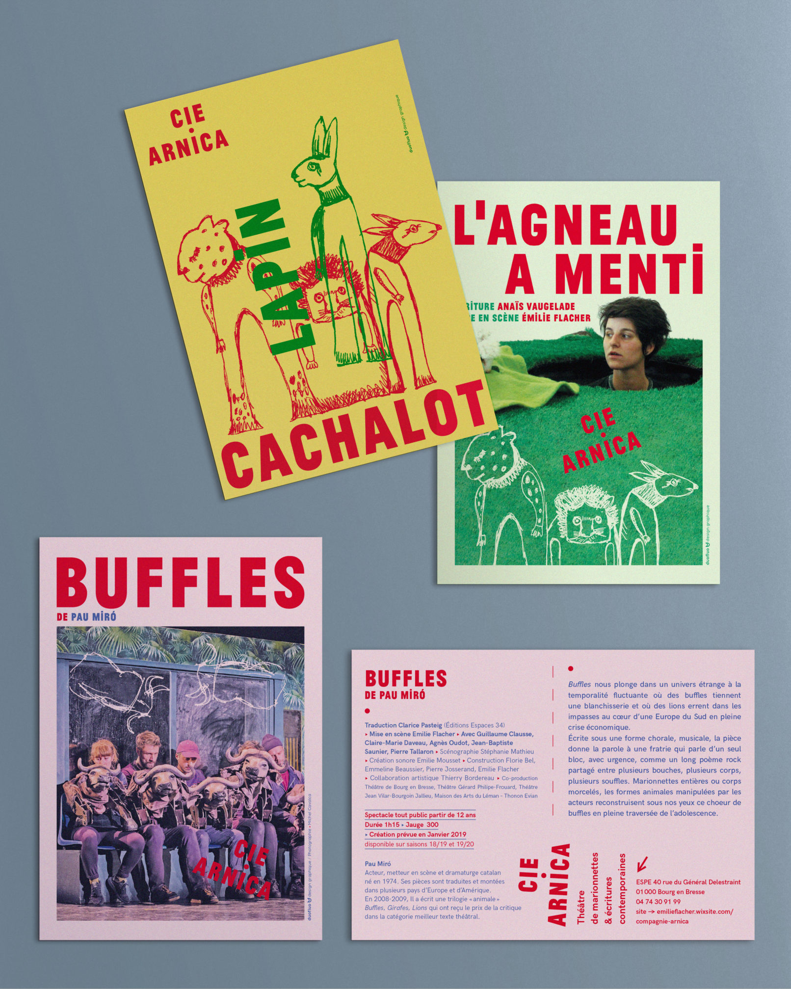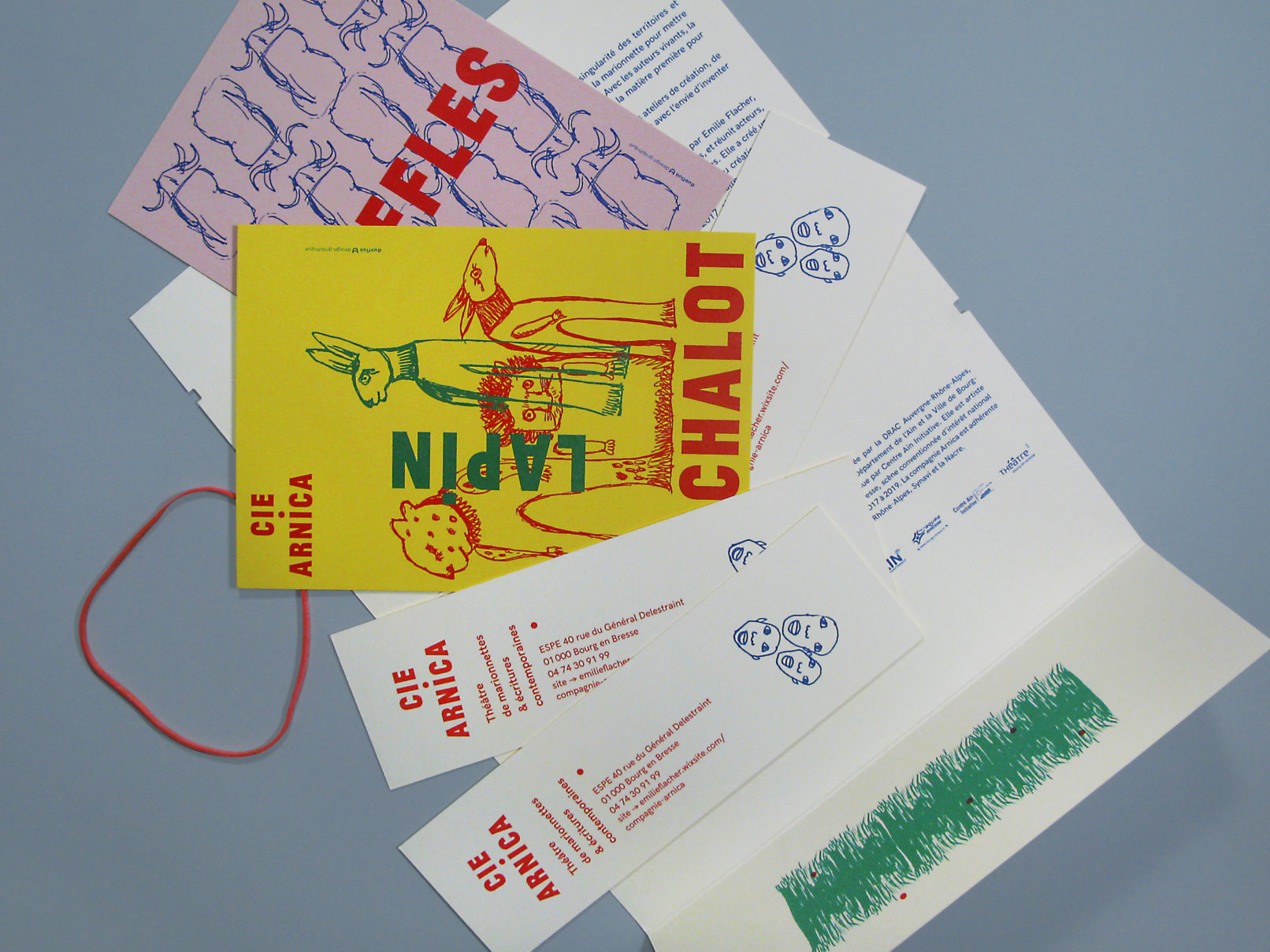 La compagnie Arnica, théâtre de marionnettes & écritures contemporaines, est aussi un lieu de fabrique. L’identité visuelle associe, dans un esprit artisanal, une typographie « tampon » et les croquis de la metteure en scène Emilie Flacher. Les supports sont imprimés en 3 teintes sur la gamme de papier Woodstock chez Fedrigoni.
