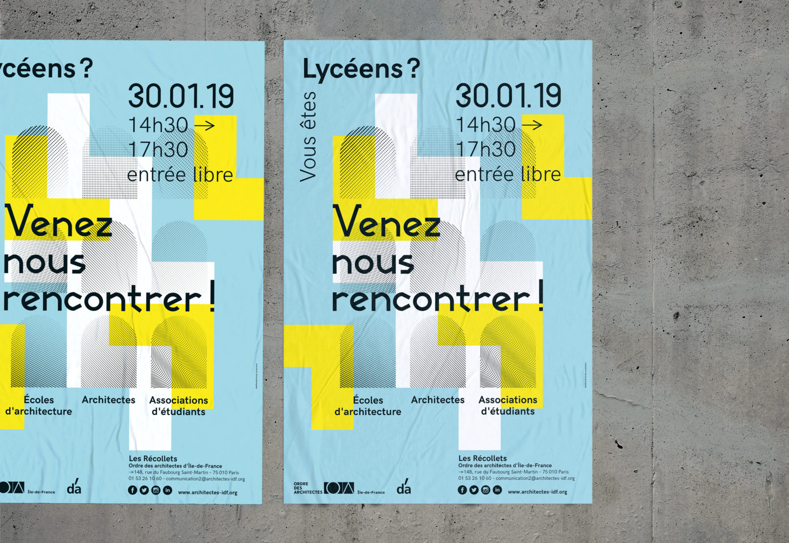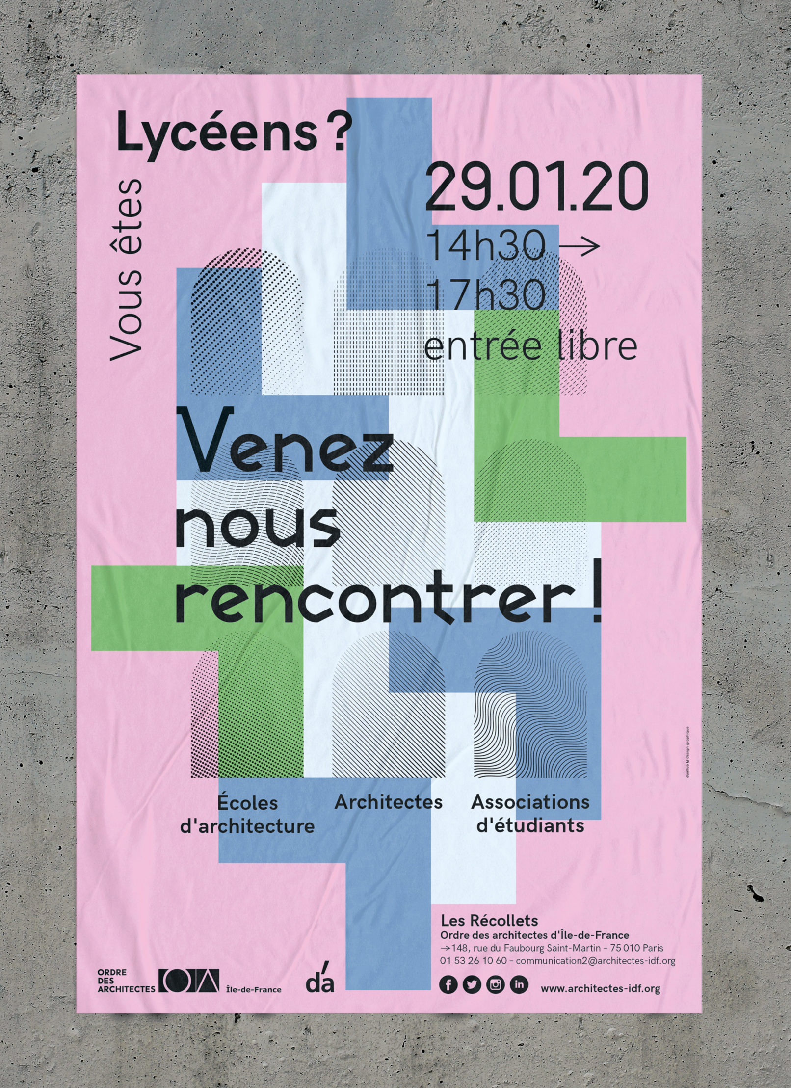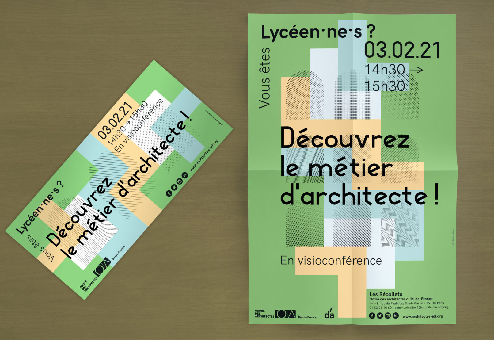 L’Ordre des architectes d’Île-de-France propose un après-midi d’information à destination des lycéens et de leurs familles. L’affiche événementielle, créée selon l’identité visuelle élaborée par duofluo, change ses couleurs chaque année.